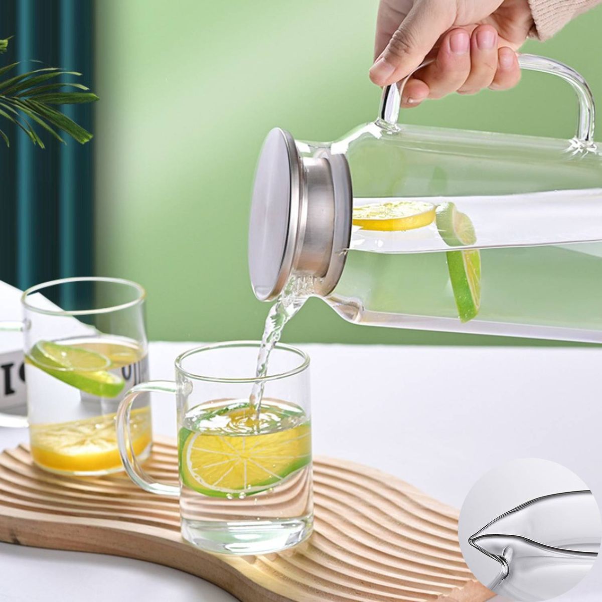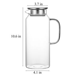 This glass pitcher holds 62oz of your favorite beverages, standing 10.6" tall with a 4.1" base diameter and 3.7" top opening. Made of durable, heat-resistant borosilicate glass, it features a stainless steel lid with silicone gasket to prevent spills. The crystal-clear design showcases colorful drinks while the ergonomic handle ensures comfortable pouring. Perfect for iced tea, lemonade, infused waters, or sangria, the pitcher fits standard refrigerator doors.